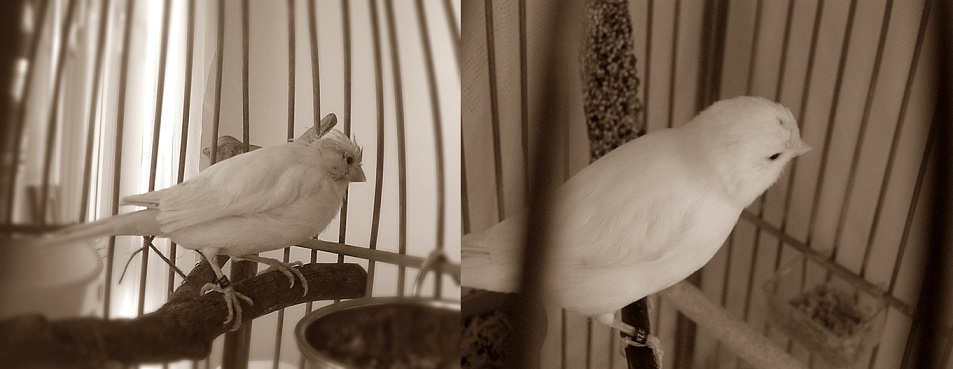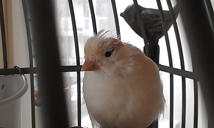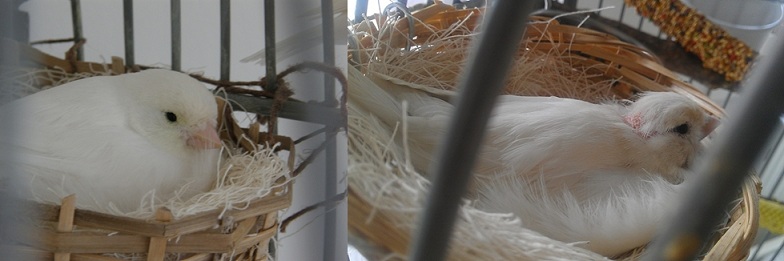 Sophie recesszív, hófehér, ezért több A-vitamin kell neki, mert ő nem tudja elállítani. Így a pellet jó megoldásnak tűnt, szereti is. Azonban a kopaszodás nem múlik, nem igazán jönnek új tollak, sőt, amiért most megint írok, az az, hogy a tojó mellett lévő hím is elkezdett kopaszodni. A hímnek eddig semmi baja volt, ráadásul ugye mostanában kezd egyre világosodni az időjárás - Norvégia természetesen köztudottan sötétebb egy kicsit télen (habár szerintem itt többet süt a nap, mint Magyarországon), ezért jövő télre biztos beszerzek a madaraimnak egy UV lámpát, a mostani melegítő lámpa helyett, ami hüllőkhöz van)