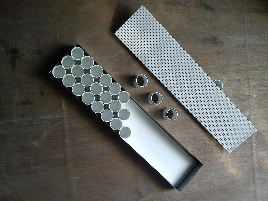 100as gipszkarton U profil tálca, benne 32mm es kanalizálási PVC cső, magasságuk 1mm rel nagyobb a profil oldalmagasságánál. Fedél fürdőszobai álmenyezet, lukacsos lemez. Egyik vége enyhén felhajtva, hogy csúsztatható legyen. Két befőttes gumi a biztonság kedvéért szökés ellen.