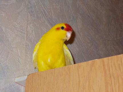 A hímje majdnem teljesen vad színű, a tarkójában van néhány sárga toll... Szóval zöld-tarka.